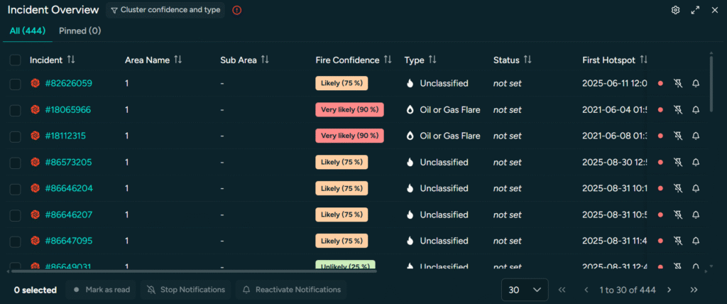 Panel Incident Overview yang telah disediakan dapat digunakan pengguna untuk melihat history dan api yang baru muncul peserta dengan perkembangannya. Perkembangan yang dimaksud termasuk Fire Confidence tiap hotspot. Panel ini sangat berguna dalam hal monitoring kebakaran dan menjadi modal awal dalam pembuatan laporan insiden.