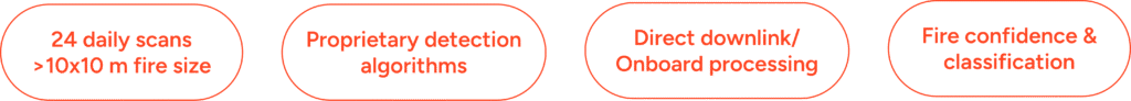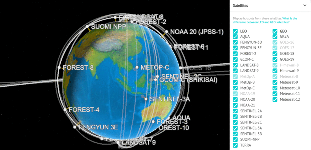 Teknologi Wildfire Monitoring Solution kami memiliki jumlah konstelasi satelit sebanyak +32 yang melakukan observasi 24/7. Satelit yang digunakan merupakan gabungan dari 20 satelit LEO (Low Earth Orbit) dengan resolusi tinggi dan 12 satelit GEO (Geostationary Orbit) dengan waktu observasi lebih cepat