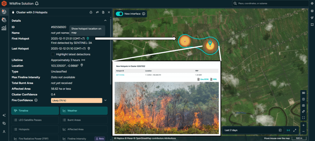 Lokasi pertama kali api muncul di kebun anda akan ditampilkan secara akurat dalam platform OroraTech. Informasi yang disediakan berupa titik koordinat dan waktu pertama kali muncul. Sehingga dengan informasi tersebut bisa segera dilakukan mitigasi oleh pihak dilapangan.