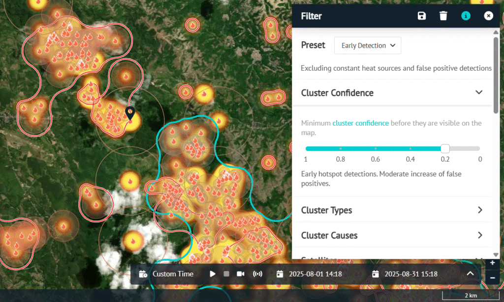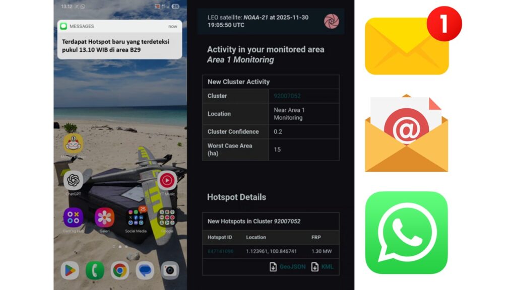 Peringatan dini kebakaran secara akurat dengan detail titik api pertama kali muncul berupa lokasi area, intensitas, dan penyebaran api secara langsung oleh satelit yang bekerja 24/7. Deteksi dini sangat membantu dalam mitigasi awal sebelum api meluas pada aset anda, dapatkan notifikasi awal titik hotspot melalui perangkat selular anda.