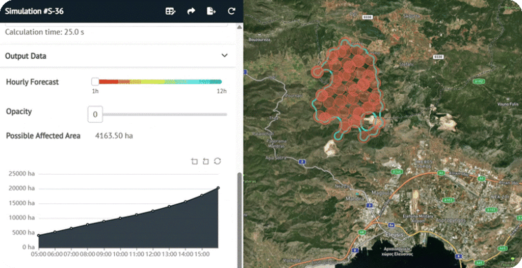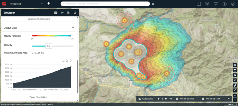 Fire Spread merupakan salah satu fitur unggulan yang ada dalam Wildfire Monitoring Solution. Fitur ini memungkinkan pengguna untuk membuat simulasi persebaran api hingga 12 jam kedepan. Dengan melakukan integrasi dengan informasi cuaca berupa kecepatan angin, arah angin, dan kelembapan di wilayah pemantauan, maka persebaran api akan dapat diprediksi hingga luas area yang akan terdampak