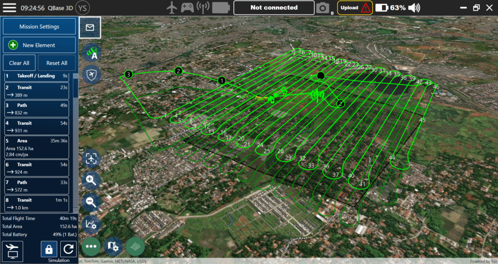 Untuk melaksanakan pekerjaan survei liDAR, kami melakukan perencanaan penerbangan terlebih dahulu. Perencanaan yang baik akan menghasilkan data dengan kualitas tinggi, kami mempertimbangkan lokasi pengukuran dan membuat perencanaan penerbangan yang aman pada Qbase 3D. Untuk efisiensi waktu, kami memaksimalkan UAV Trinity Pro dengan sensor LiDAR agar dapat mencakup area luas dalam sekali penerbangan. Tentunya akan dipadukan dengan perencanaan pemasangan base station untuk menghasilkan data dengan akurasi yang tinggi.